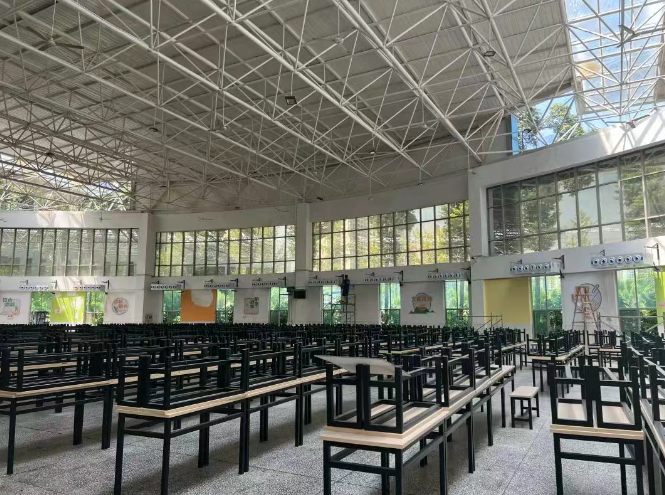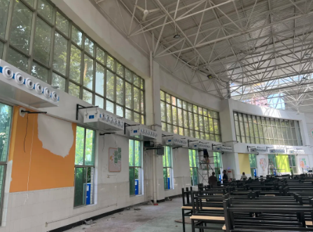 项目挑战• 高温+高密度:几百名学生同时就餐,人体散热+厨房热量让室温快速上升。• 超高层高:12米层高意味着冷气容易滞留在顶部,地面温度依然闷热,形成“头冷脚热”的不适感。• 油烟环境:学校食堂空气中含有油烟与水汽,容易影响空调换热效率与使用寿命。