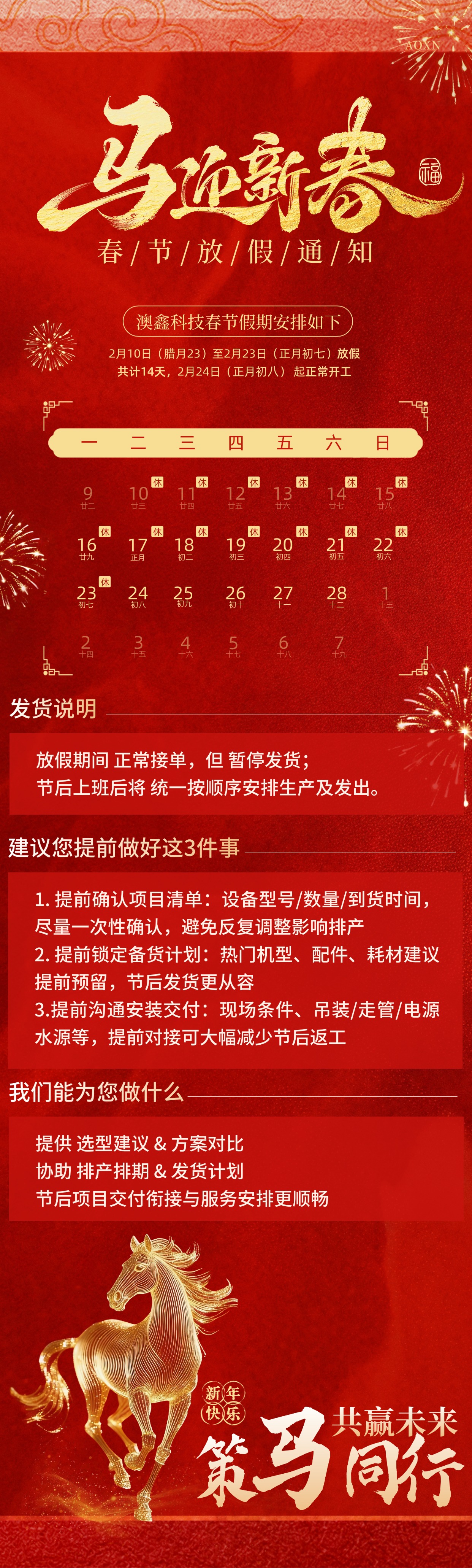 为方便您提前安排项目进度与备货计划,现将我司春节假期及发货安排温馨告知如下: