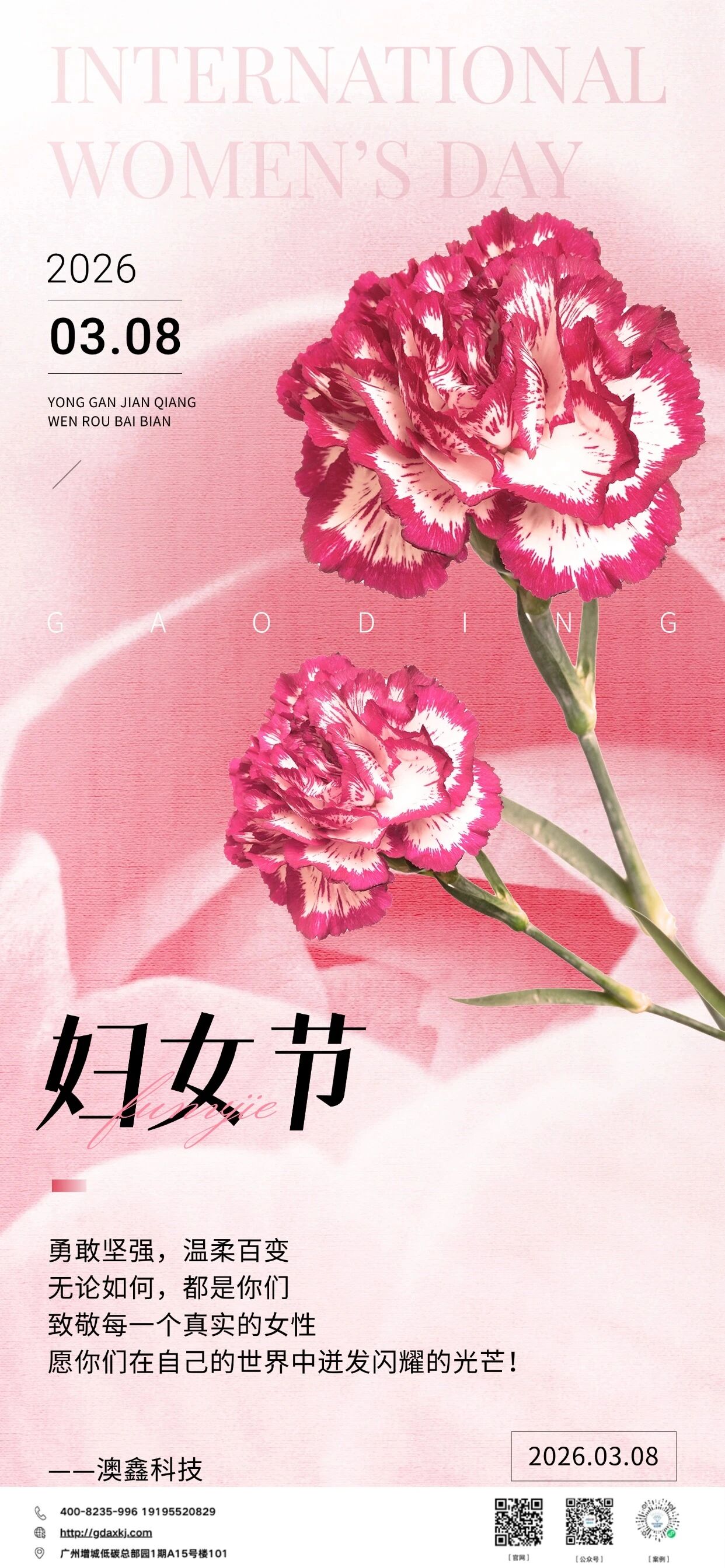 值此妇女节来临之际,向公司全体女性同事致以最诚挚的节日问候和最崇高的敬意!感谢你们立足岗位、敬业奉献,感谢你们以独特的智慧与力量,为企业发展注入温暖而坚定的能量。