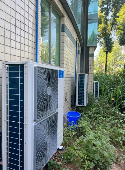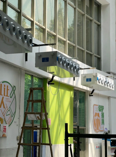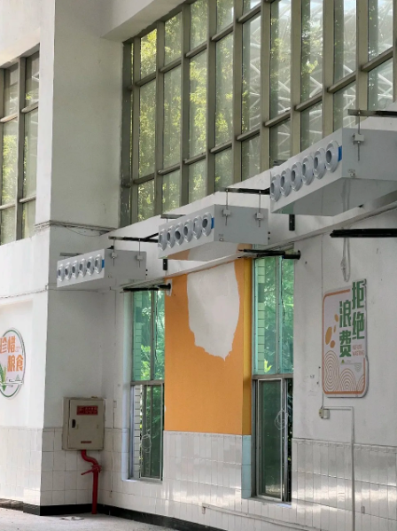 项目挑战• 高温+高密度:几百名学生同时就餐,人体散热+厨房热量让室温快速上升。• 超高层高:12米层高意味着冷气容易滞留在顶部,地面温度依然闷热,形成“头冷脚热”的不适感。• 油烟环境:学校食堂空气中含有油烟与水汽,容易影响空调换热效率与使用寿命。