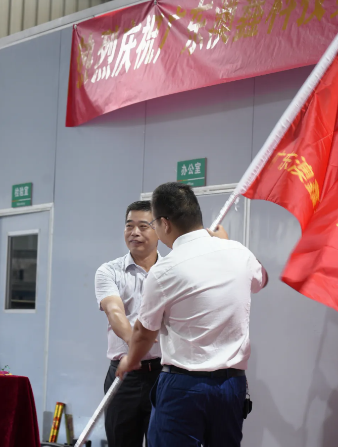(廖俊军总经理将会旗授予吴稳成厂长)